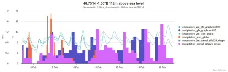 Cumul de 8mm à 6h30 au 3/2. Cumul 140mm 31/1. Variable accompagné d'averses aujourd'hui. Demain variable avec pluie l'après-midi et soir. Jeudi et vendredi pluie. Variable à rares ondées samedi et ciel d'éclaircies dimanche. De nouvelles précipitations s'installeront toute la semaine prochaine. Vers un temps plus frais le 14 et 15 puis retour en flux Atlantique jusqu'à la lune du 19. A confirmer! Retrouvez les autres diagrammes dans tendances saisonnières meteoblue